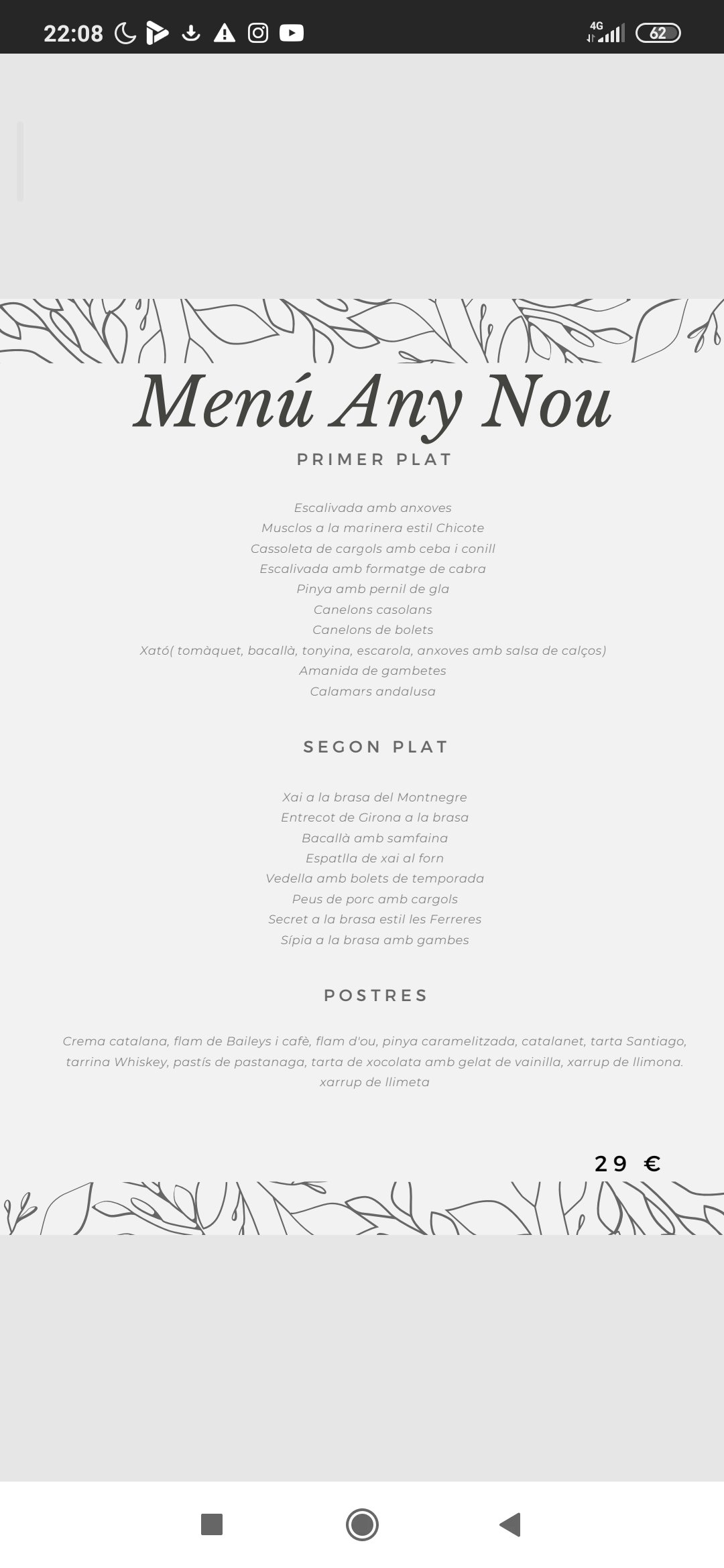 Menú any nou Publicado por restaurantlesferreres el diciembre 4, 2021 Comparte esto: Haz clic para compartir en X (Se abre en una ventana nueva) X Haz clic para compartir en Facebook (Se abre en una ventana nueva) Facebook Me gusta Cargando... Relacionado
