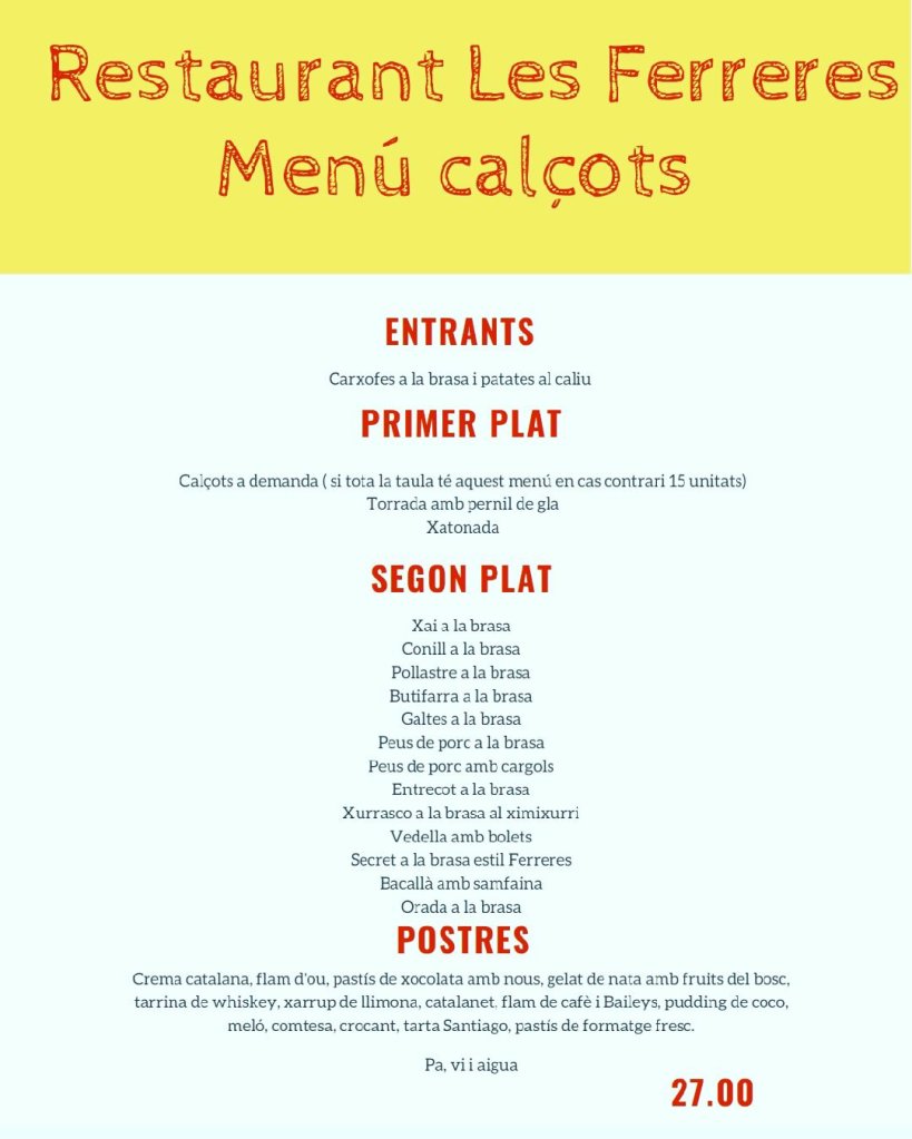 Temporada de calçots Publicado por restaurantlesferreres el enero 3, 2022 A partir del cap de setmana del 8-9 de gener comencem la nova temporada de calçots. Reserva amb antelació al 937640607. No us quedeu amb les ganes. Comparte esto: Haz clic para compartir en X (Se abre en una ventana nueva) X Haz clic para compartir en Facebook (Se abre en una ventana nueva) Facebook Me gusta Cargando... Relacionado
